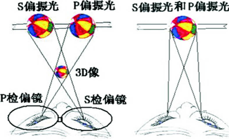 通过光的“偏振原理”实现的,用两台投影机同时间出播放图像,将两台投影机前的偏光片的偏振方向互相垂直,让产生的两束偏振光的偏振方向也互相垂直。而偏振光投射到专用的投影幕上再反射到观众位置时偏振光方向须不改变,观众通过偏光眼镜每只眼睛只能看到相应的偏振光图像,从而在视觉神经系统中产生立体感觉。