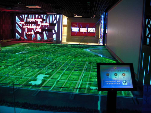 多媒体电子沙盘产品有很多的优势,与传统的沙盘相比,它的功能更丰富,扩展性更强大,功能丰富指的是,它加入了很多的高科技元素,比如由计算机与定制的控制箱组成的灯光控制系统,通过程序与多媒体演示系统的配合,可以实现同步控制模型上的灯光状态,或闪烁或流动。模型灯光遥控系统通过无线电遥控,PDA掌上电脑或激光笔与定制开发的接收控制箱配合,可以实现控制几十甚至几百路模型灯光,实现单点亮、组合亮和全亮等灯光效果。使用摇头灯、扫描灯、激光灯、LED灯等舞台灯等可以渲染和突出模型的演示效果,当沙盘上的某部分灯光亮时,上方悬挂的摇头灯可同时向此部分打出相应的光圈,或是为渲染气氛在沙盘上打出多种花纹和色彩,演示效果光彩夺目,栩栩如生。红外人体检测也是多媒体电子沙盘中包含的内容,也是一套用于大型沙盘模型的自动语音解说方案,在观众走到红外开关区域发送地址信息给自动语音解说模块,自动语音解说模块开始播放相应解说词,如果观众离开,播放将停止,等待下一位观众。触摸屏一体机一般用来方便讲解员、参观者调看触摸屏上所演示的内容,但将触摸屏一体机的计算机信号与音频信号接入到等离子电视或投影仪及功放音箱上,在电视屏幕上就可同步显示演示的文字、图片、视频、动画、解说等内容了。激光笔无线控制,激光笔沙盘控制是在沙盘的具体区域安上相应的接收器,讲解者用激光笔指向沙盘的某个区域时沙盘上的灯光马上随之发光,同时相应的解说词配合灯光演示。升降局部沙盘可实现多媒体电子沙盘的多层次展示,可使项目原来不在可视范围内的内容呈现给参观者。